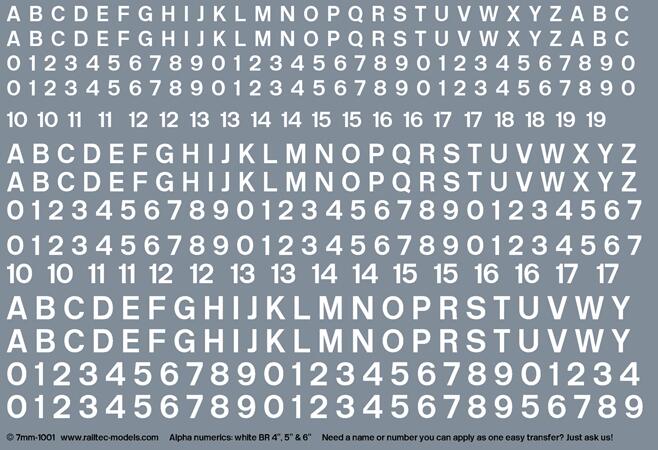 Numbers and lettering in 4", 5" and 6" sizes in BR white font. Note in 7mm scale these sizes equate to 2.33mm, 2.9mm and 3.5mm respectively.