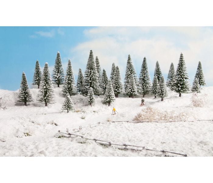 These "snow firs" are ideal for realistically recreating high-quality wintry landscape scenes in a model landscape. There are many forests in real nature and they should not be missing on a model landscape. Whether deciduous trees, spruces, larches or Mediterranean trees - the most diverse tree species make a landscape scene appear even more realistic and idyllic. In winter, the forest shines with a white layer of snow and the cold season makes nature happy. The forest animals seek shelter under the tall trees and people walk through the dense forest when the weather is nice and snowy. Create idyllic natural scenes with the "snow firs" under the standard trees and ensure a real eye-catcher on your layout.