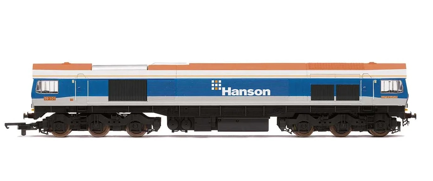 The hugely successful EMD Class 66 is partially a development of the Class 59 and shares many components including its bodywork. Locomotive No. 59101 was one of the 4 ARC locomotives to be built in Canada. The locomotive arrived in Britain in October 1990 and entered service the following month. By the time the locomotive had arrived ARC had been purchased by Hanson PLC and as a result over the next few years all four of the ARC order locomotives were repainted into the blue and white Hanson livery.