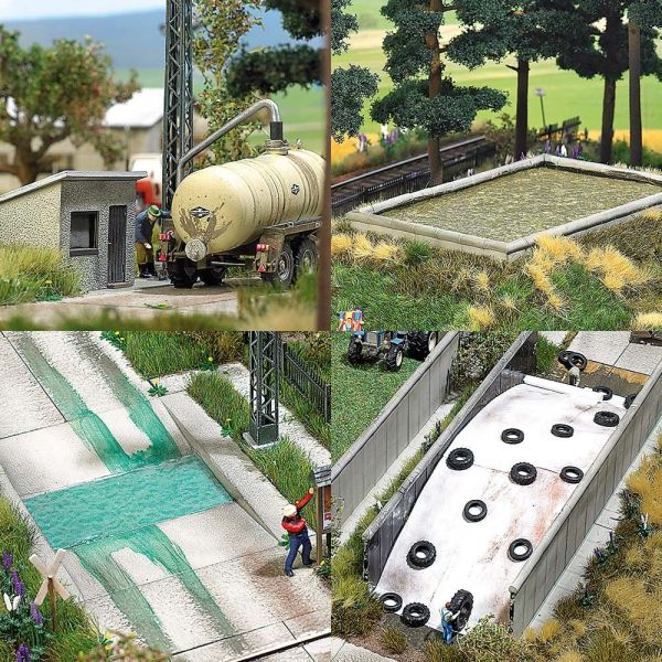 Make your farm complete with these accessories. This kit contains a vehicle disinfectant basin (approximate size 80mm (length) by 85mm (width)), a concrete horizontal silo with a plastic foil covering and vehicle tires (approximate size 180mm (length) by 65mm (width) by 35mm (height)) and a liquid manure basin with realistic surface (approximate size 130mm (length) by 90mm (width)) together with the a pumping station with shelter, filler neck with hand wheel and switch control cabinet (approximate size 40mm (length) by 20mm (width) by 25mm (height)).