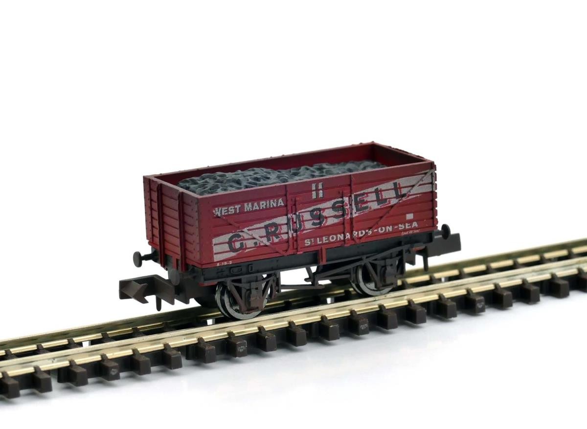 Highly detailed 1:148 Scale N Gauge model of a 7 Plank Wagon, with a weathered finish, bearing the private owner livery of G Russell from St Leonards on Sea.