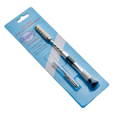 This set contains one Archimedes drill with an aluminium handle, 1.0mm, 1.5mm and 2.0mm HSS twist drills and 2 double ended collets.