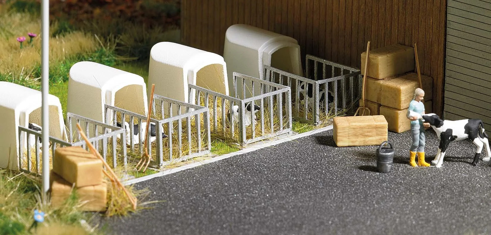 Veal crate with lying calf, fence, bales of hay and stable tools.