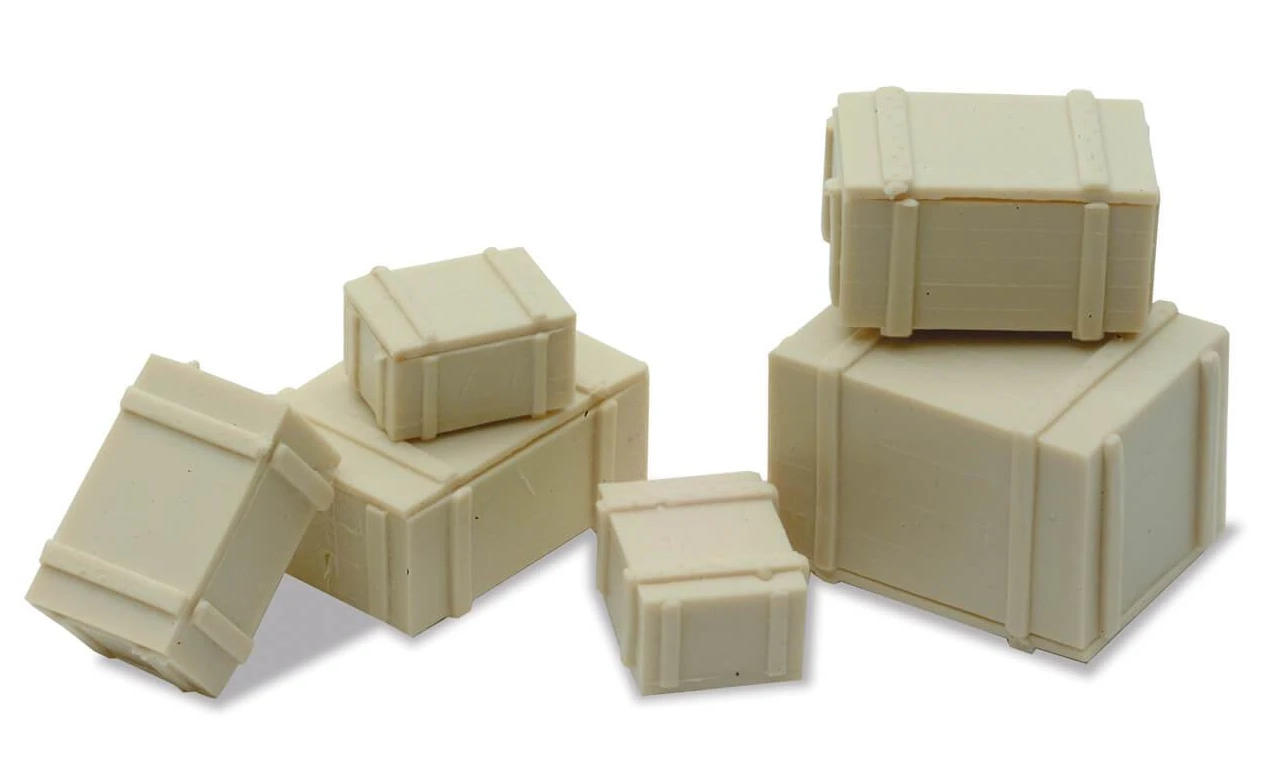 Pack of 6 OO scale assorted packing cases that add detail to any model railway plaform or scene.