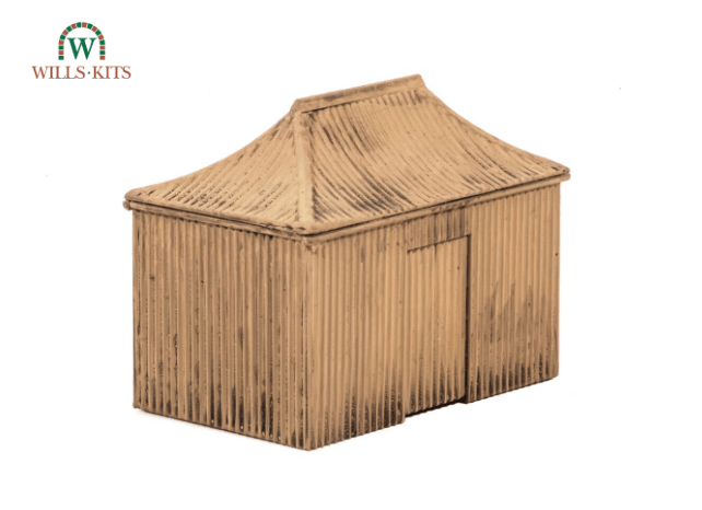 This distinctive prefabricated corrugated iron building was used by the GWR as a passenger platform shelter and a storage hut. Supplied with pre-coloured parts although painting and/or weathering can add realism; glue is required to complete this model. Footprint: 62mm x 39mm.